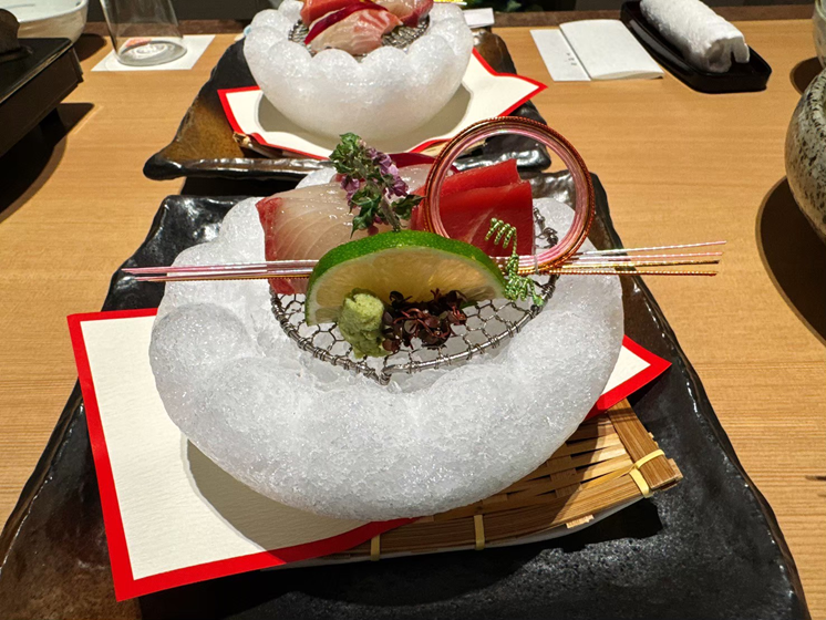 氷の器に盛り付けられたお造り(鯛・本鮪・平政)