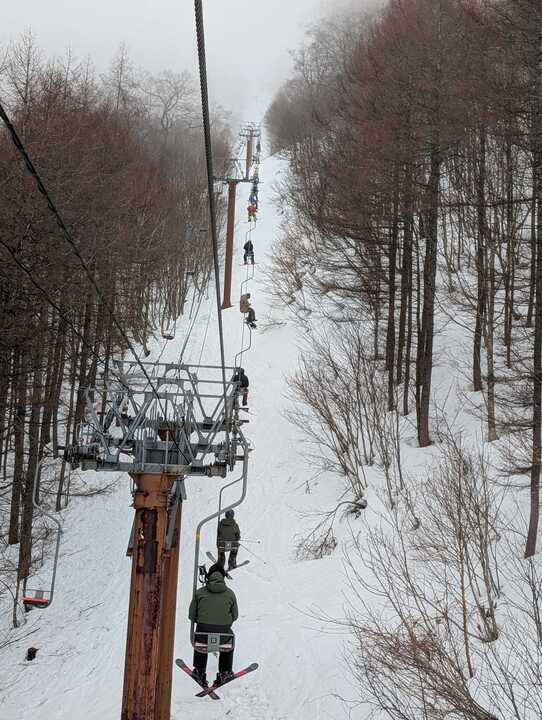 このスキー場には今ではとてもレアらしい1人乗りリフトがあります。初めて乗りましたが、落下防止のバーがなく、小さな板に乗って運ばれていくだけの不安定な乗り物でちょっとしたアトラクション気分を味わえました。