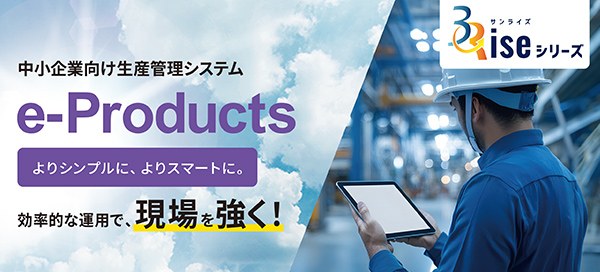 e-Productsは、中小企業向け生産管理システムです。生産管理の現場で求められる機能だけに厳選し、分かりやすさと導入のしやすさを追求した中小企業のための生産管理システムです。誰でも使いやすいシンプル設計で、現場業務の課題解決を支援します。